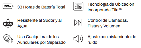 • 33 horas de batería total: 9 horas en los auriculares, 24 horas en el estuche