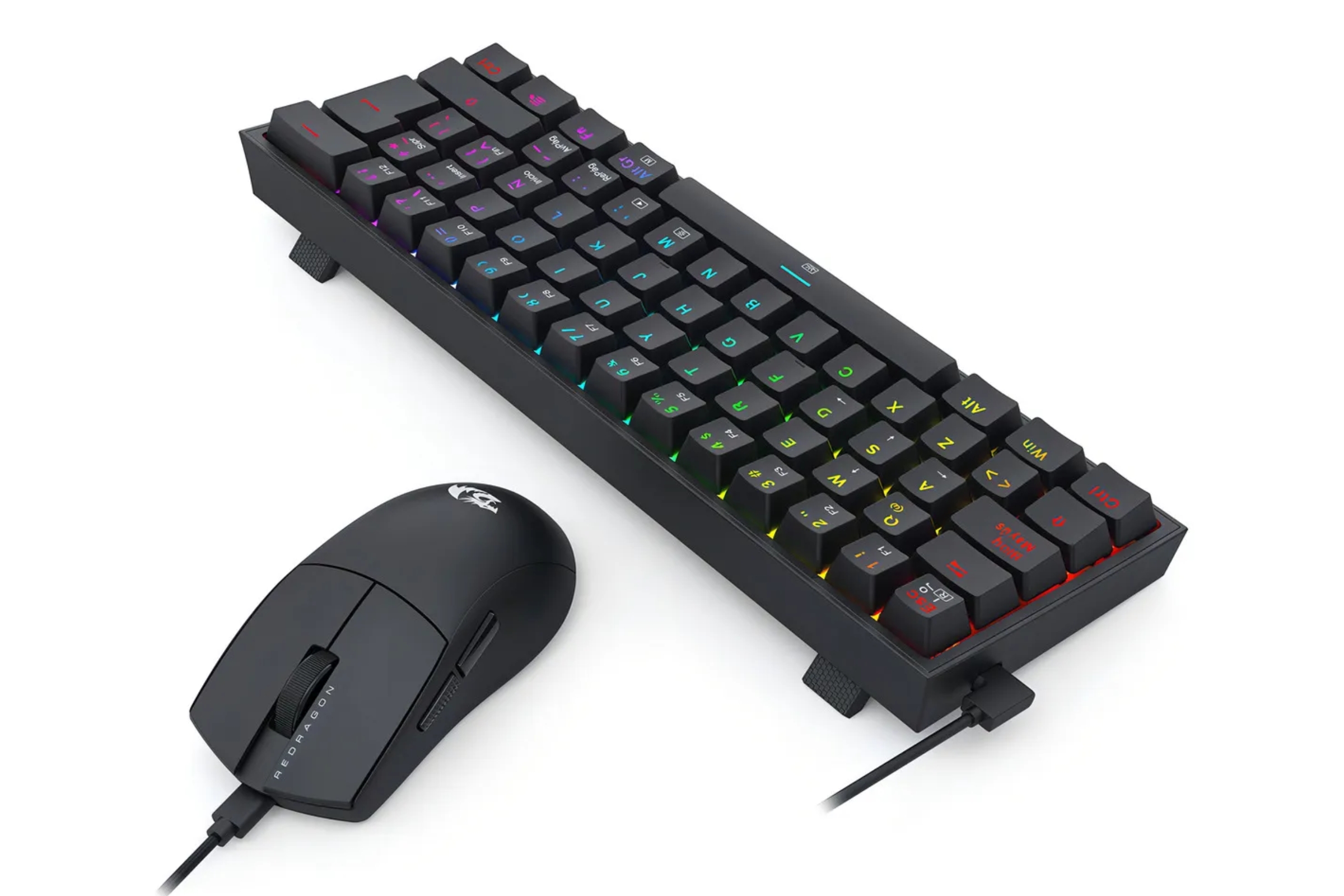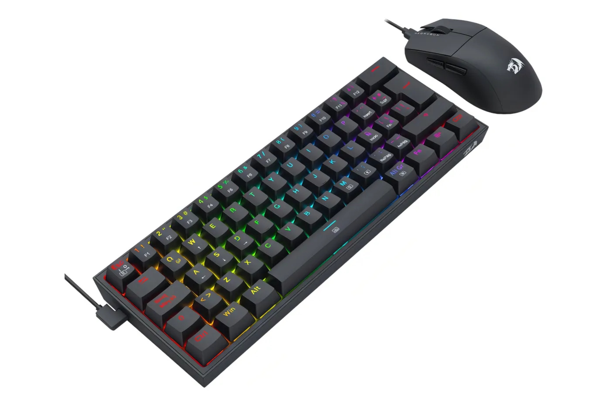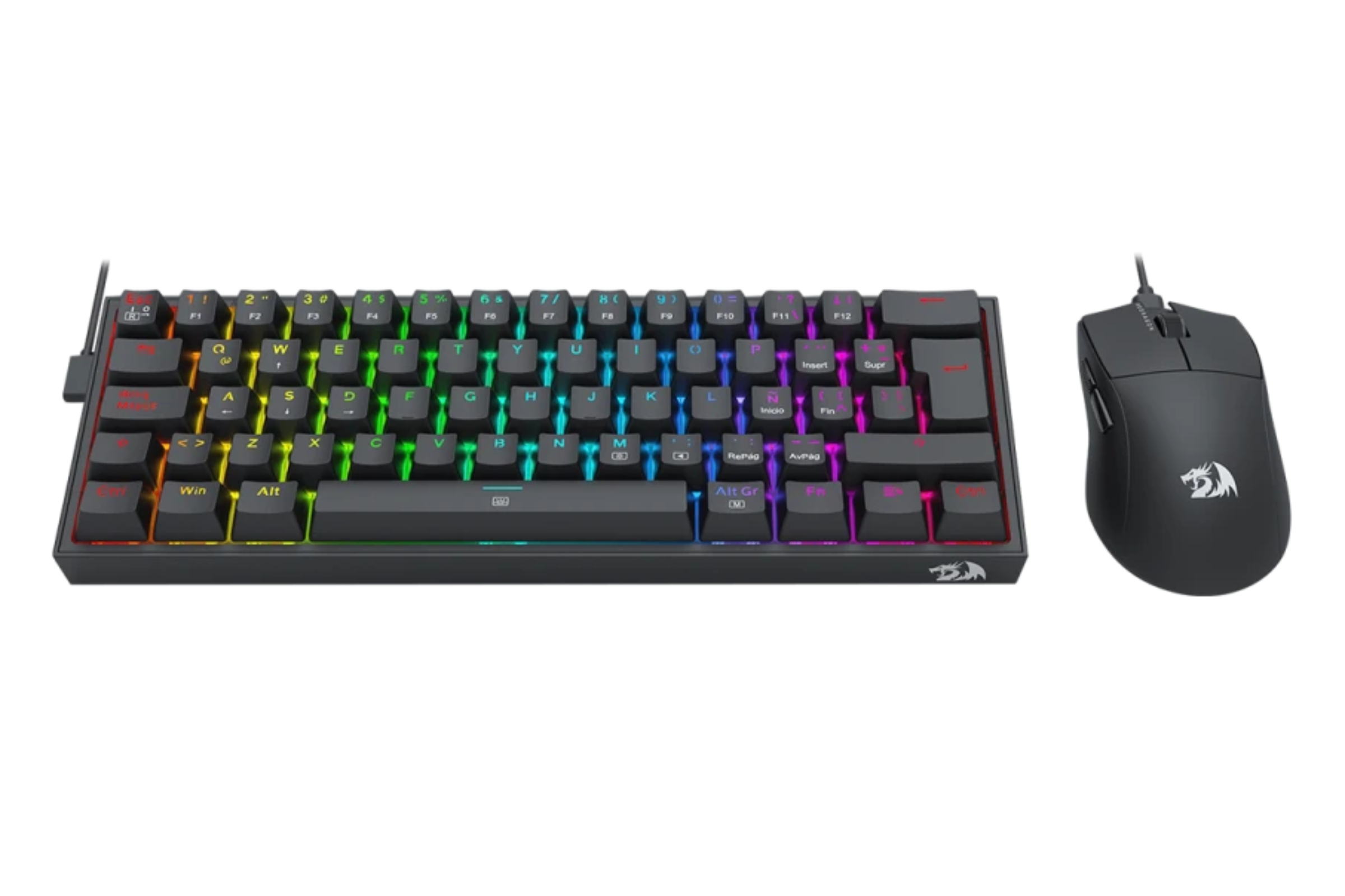 El teclado de este combo es de tamaño compacto 60%, lo que deja mucho más espacio de movimiento al ratón. Está equipado, además, con switches Redragon que soportan hasta 50 millones de pulsaciones y, por ser encapsulados, son resistentes al polvo y las salpicaduras. Adicionalmente, cuenta con retroiluminación RGB Chroma, fácilmente configurable y personalizable; y cable tipo-C extraíble, sumamente práctico.