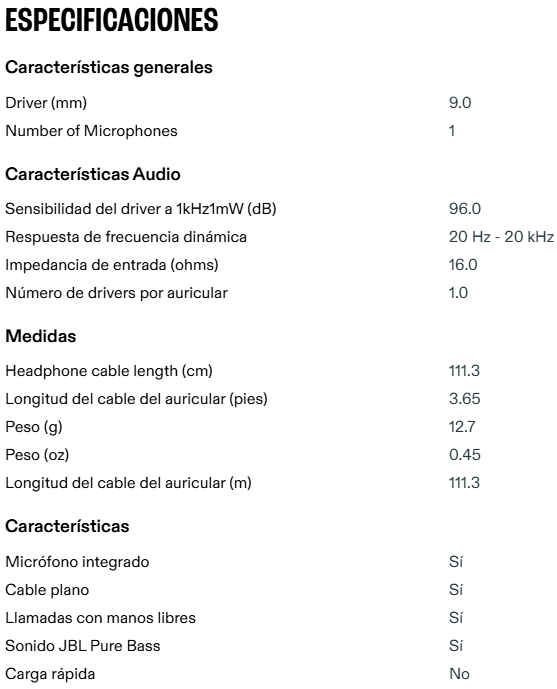Le presentamos los auriculares intraaurales JBL TUNE110. Son ligeros, cómodos y compactos. Dentro de la carcasa de auricular duradera, un par de unidades de 9 mm ofrecen bajos notables y reproducen el sonido Pure Bass de JBL que ha experimentado en salas de conciertos, pabellones y estudios de grabación de todo el mundo. Además, el control remoto con un solo botón y el cable plano sin enredos le permiten controlar la reproducción de la música y responder a llamadas sobre la marcha con un micrófono integrado. Todo ello hace que los JBL TUNE110 sean su compañero diario en el trabajo, en el hogar y de un lado a otro.