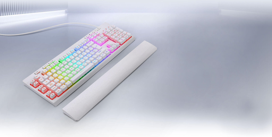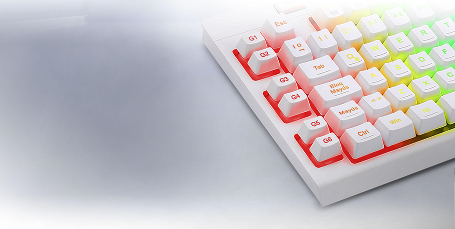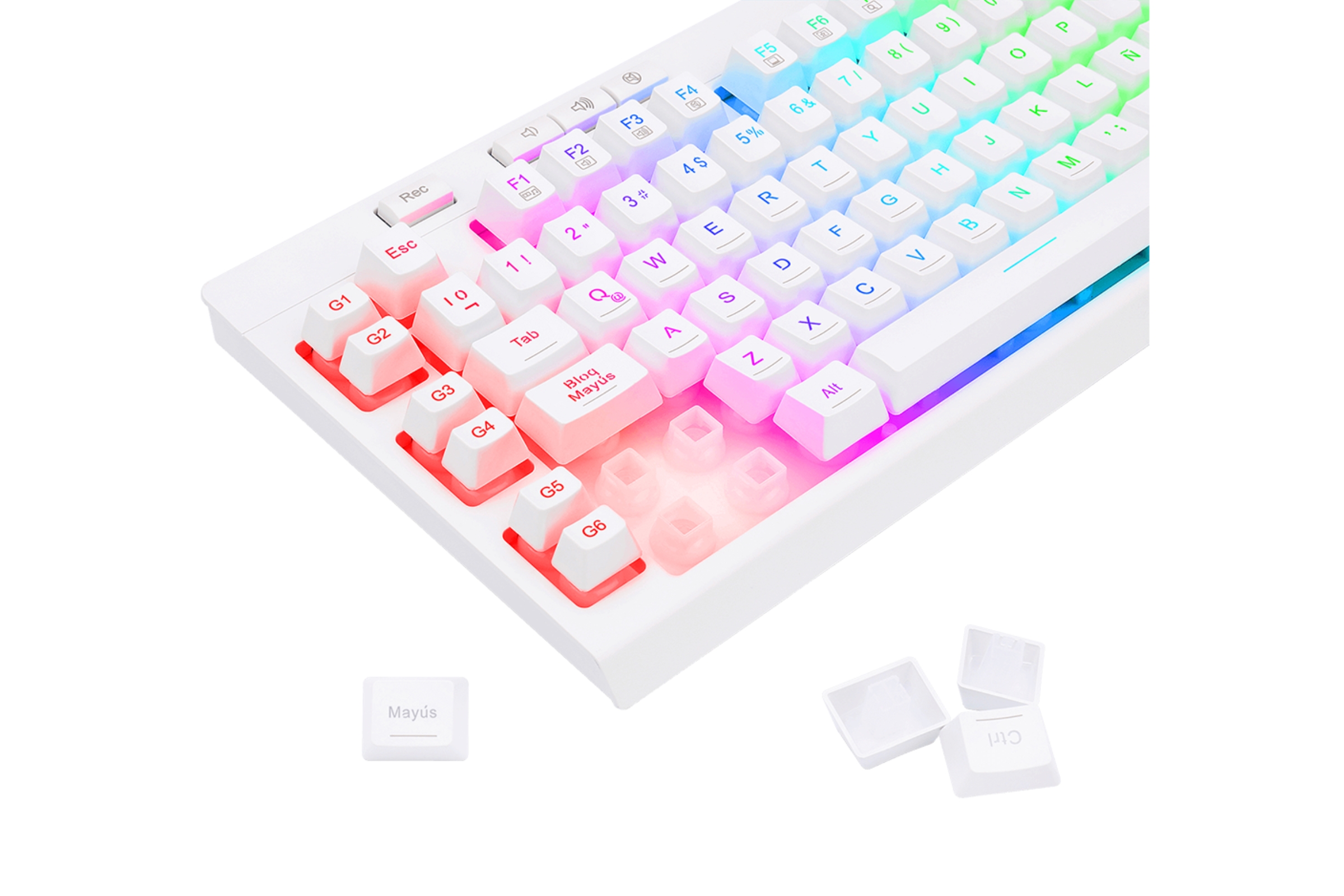 Cada tecla o keycap es el resultado de la combinación y encastración de dos piezas, una de color y otra transparente. El efecto práctico es una tecla muy robusta y súper duradera, que no se borronea ni se despinta.